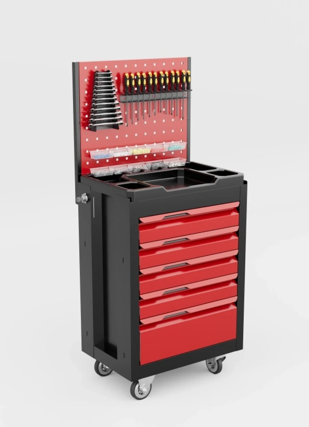 • Dayanıklı çelik gövde, 5 geniş çekmece ve organize edilebilir alet paneli ile tüm aletlerinizi düzenli tutun. ? Hareketli ve kilitlenebilir tekerlekler ? Tornavida, anahtar ve küçük parçalar için özel bölmeler ? Tamirhaneler, atölyeler ve hobi alanları için ideal