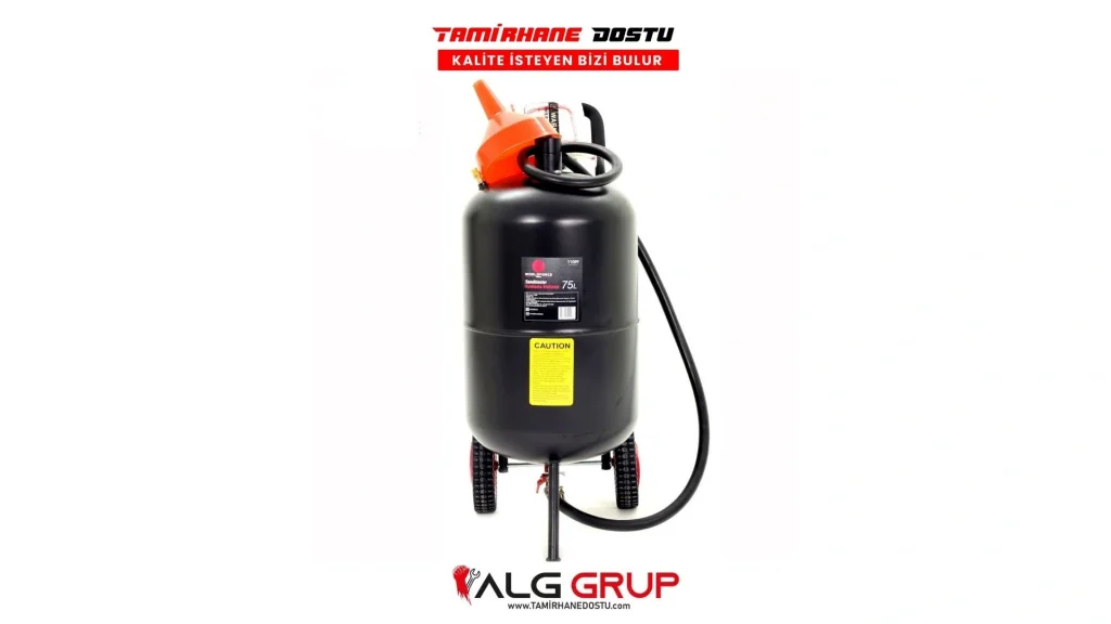 Profesyonel atölyeler ve sanayi kullanımı için üretilmiş 75 L seyyar kumlama makinesi, güçlü yapısı ve ergonomik tasarımıyla maksimum verim sağlar.
