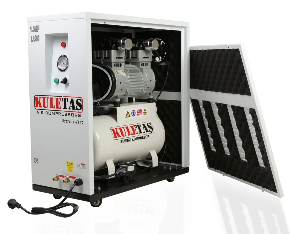 • Kuletaş Kabinli Ultra Sessiz Kompresör 30 Litre, özel kabinli yapısı sayesinde çok düşük ses seviyesinde çalışan profesyonel bir hava kompresörüdür. Yağsız sistemi sayesinde temiz hava üretir ve özellikle gürültünün az olması gereken ortamlarda kullanılır.