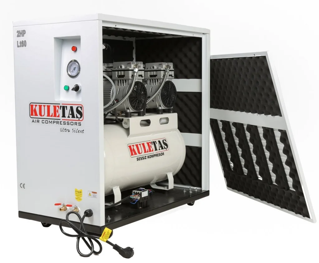 • Kuletaş Kabinli Ultra Sessiz Kompresör 60 Litre, özel kabinli ve yalıtımlı yapısı sayesinde çok düşük ses seviyesinde çalışan profesyonel bir hava kompresörüdür. Yağsız sistemi sayesinde temiz ve kuru hava üretir ve özellikle klinik, laboratuvar ve sessiz ortam gerektiren işletmeler için tercih edilir.